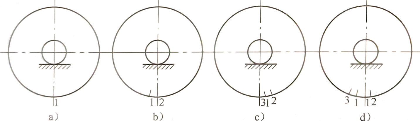 將離心通風機轉子輕放在平衡機的軌道上(或圓盤夾角內),使轉子水平軸線垂直于軌道軸線。用手扳動轉子,使其任意停止。在轉子下面作一標記“1”,如圖a。為了消除摩擦阻力矩誤差,將轉子旋轉90°使標記“1”與轉子中心線成水平位置,然后放開,待停止擺動后,在此刻轉子的最下面作標記“2”,如圖b。再將轉子向相反方向轉90,同樣使標記“1”與轉子中心線成水平位置,放開,待擺動停止后,在此刻離心通風機轉子的最下面作標記“3”,如圖c。如果標記“1”、“2”、“3”點相重合,則偏重位置就在重合點處,否則,偏重位置就在標記“2”與“3”的中間,如圖d。