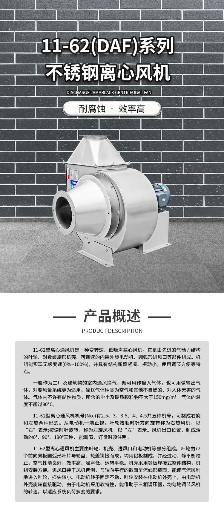 11-62型離心通風(fēng)機(jī)是一種變轉(zhuǎn)速、低噪聲離心風(fēng)機(jī)。它是由先進(jìn)的氣動力結(jié)構(gòu)的葉輪、對數(shù)螺旋形機(jī)殼、可調(diào)速的內(nèi)裝外旋電動機(jī)、圓弧形進(jìn)風(fēng)口等部件組成。機(jī)組能實(shí)現(xiàn)無級變速(0%~ 100%),并具有結(jié)構(gòu)新穎緊湊、振動小,使用調(diào)節(jié)方便等特點(diǎn)。