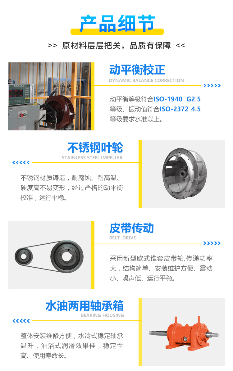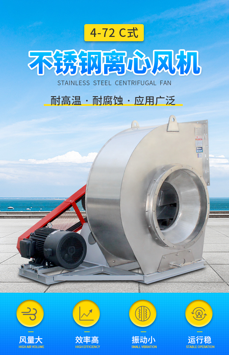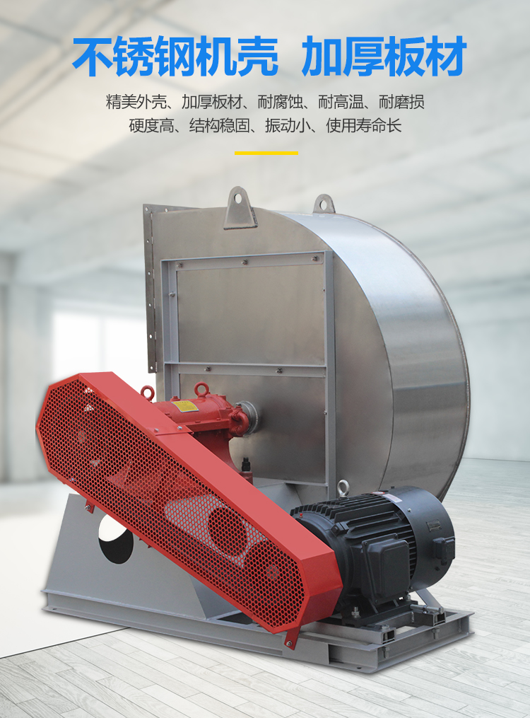 外殼及風(fēng)輪采用不銹鋼風(fēng)機(jī)材質(zhì)焊接而成,耐高溫,能有效防酸堿、防腐蝕