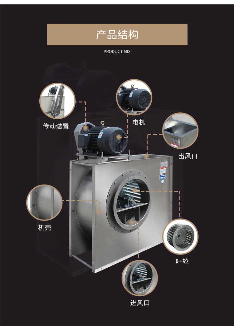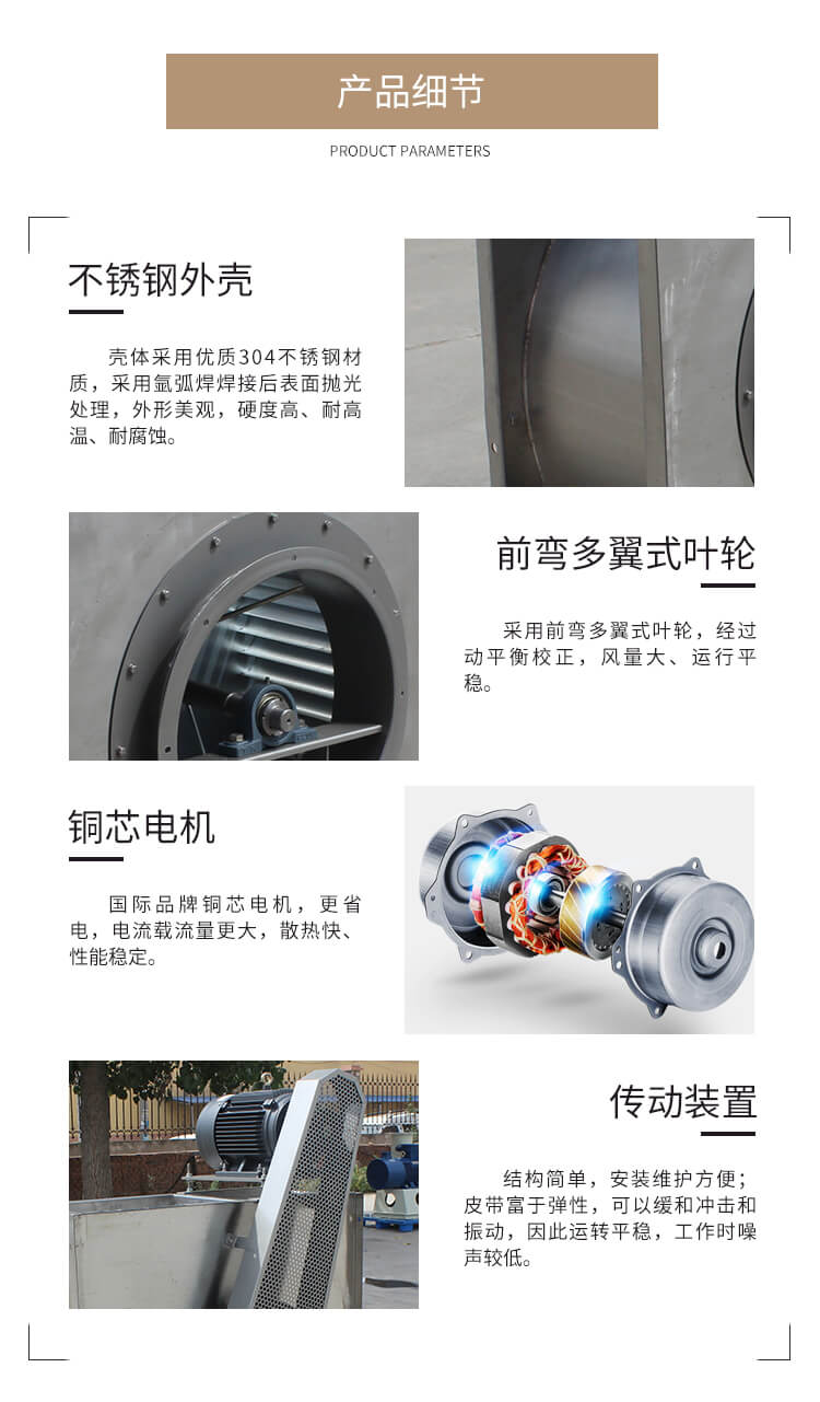 本產品為不銹鋼材質,具有耐腐蝕、強度高、大風量、效率高、安裝方便、經久耐用等優(yōu)點。前彎多翼風輪,良好的啟動性能;可根據需求定制成電機直聯式或皮帶傳動式,轉速、出風角度均可調節(jié),特殊環(huán)境可定制成防爆等級。根據客戶具體參數進行量身定制。非標定制,國標型號均可生產。