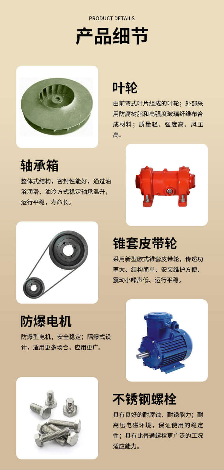 主要由玻璃鋼材質(zhì)制成,大機號也可以制成皮帶驅(qū)動,耐腐蝕性好、不易老化、噪聲低、重量輕。