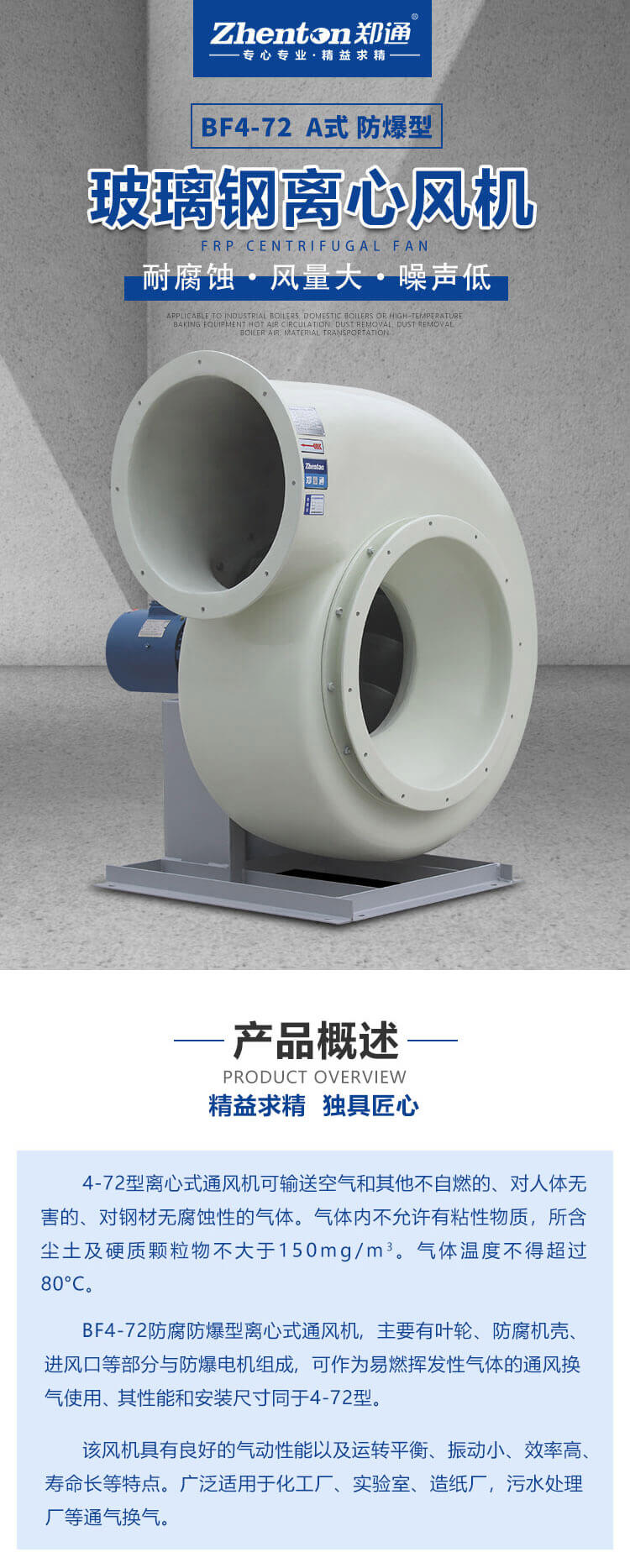 BF4-72防腐防爆型離心式通風(fēng)機,主要有葉輪、防腐機殼、進風(fēng)口等部分與防爆電機組成,可作為易燃揮發(fā)性氣體的通風(fēng)換氣使用、其性能和安裝尺寸同于4-72型。