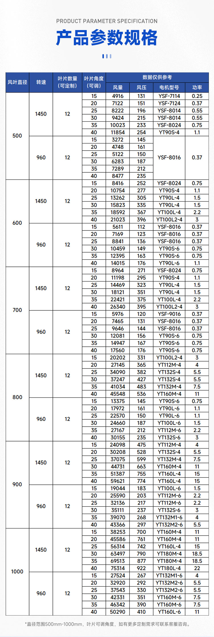葉片安裝角度可按用戶(hù)對(duì)風(fēng)量風(fēng)壓的需求進(jìn)行調(diào)整,