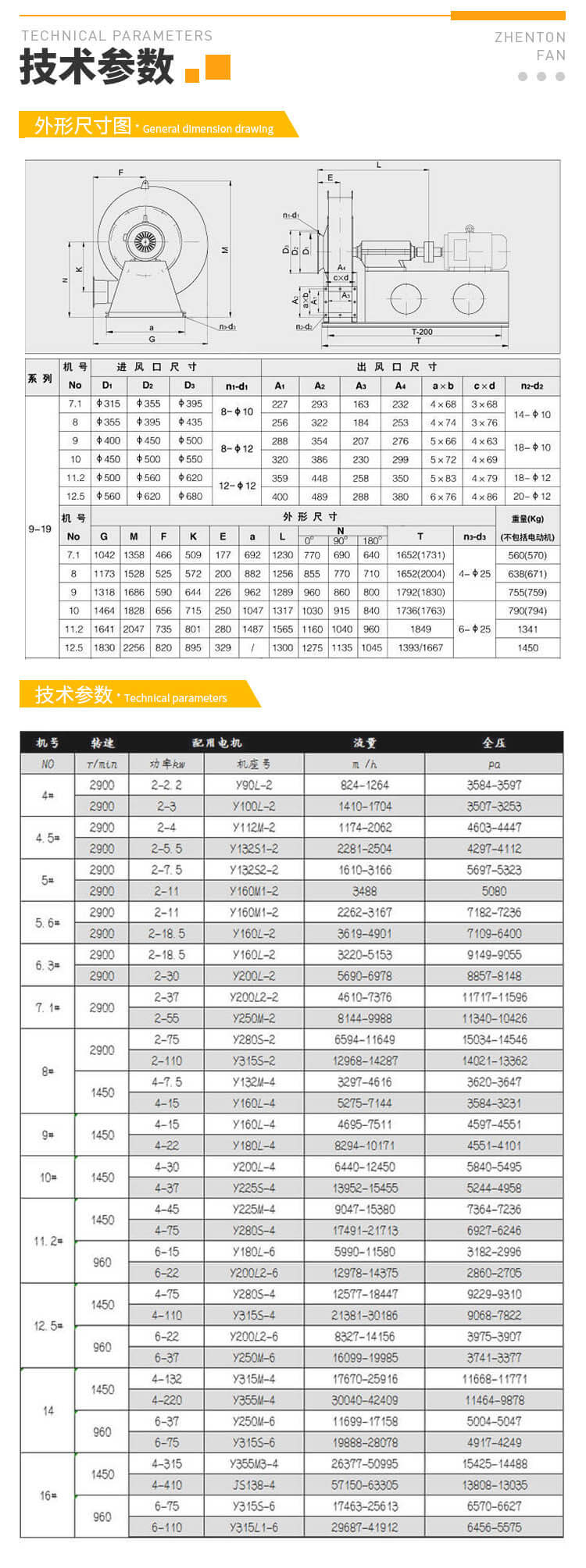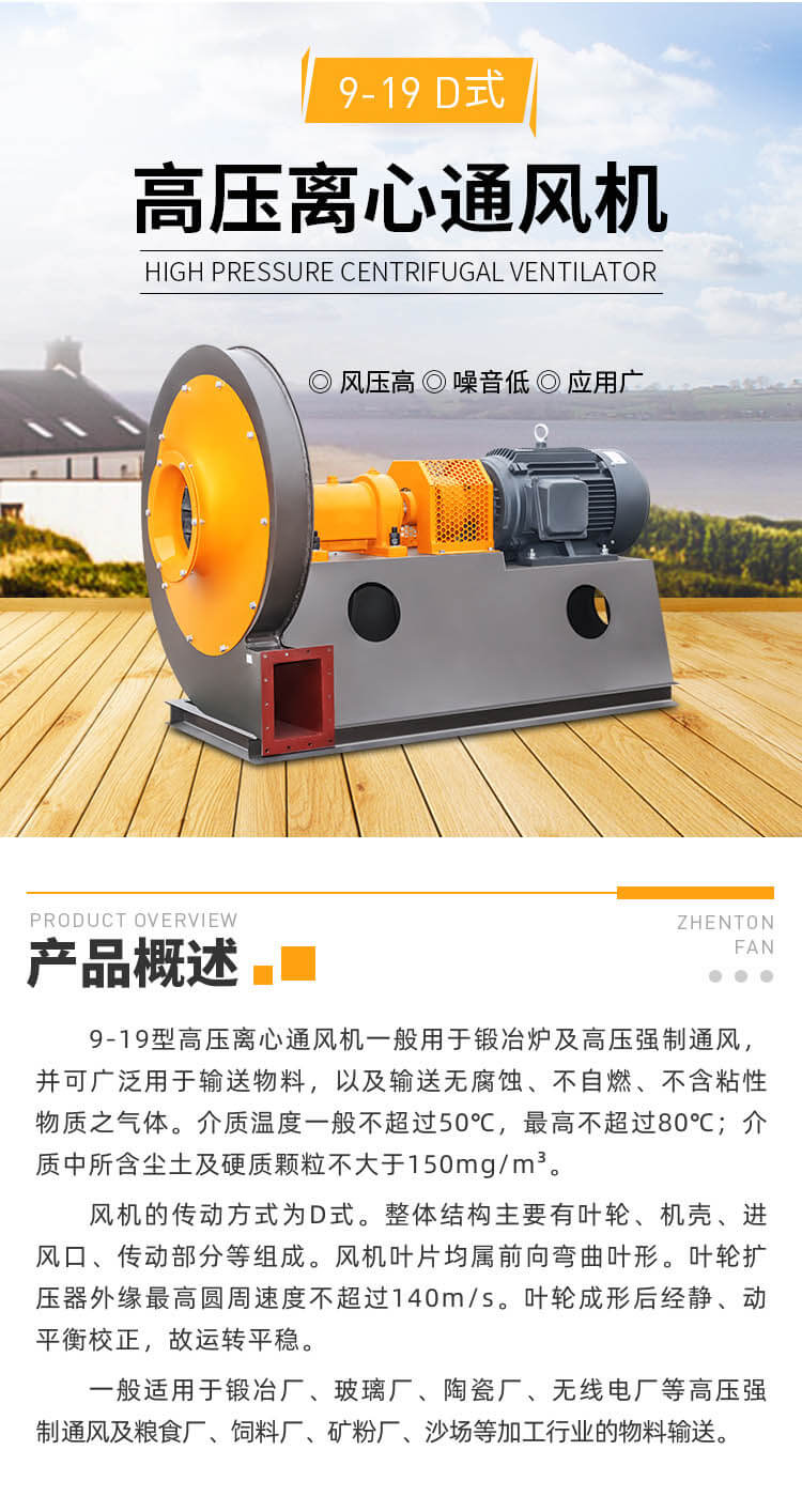 9-19型高壓離心通風(fēng)機(jī)一般用于 鍛冶爐及高壓強(qiáng)制通風(fēng), 并可廣泛用于輸送物料,以及輸送無(wú)腐蝕、不自燃、不含粘性 物質(zhì)之氣體。介質(zhì)溫度一般不超過(guò)50°C,最高不超過(guò)80°C;介 質(zhì)中所含塵土及硬質(zhì)顆粒不大于150mg/m 。