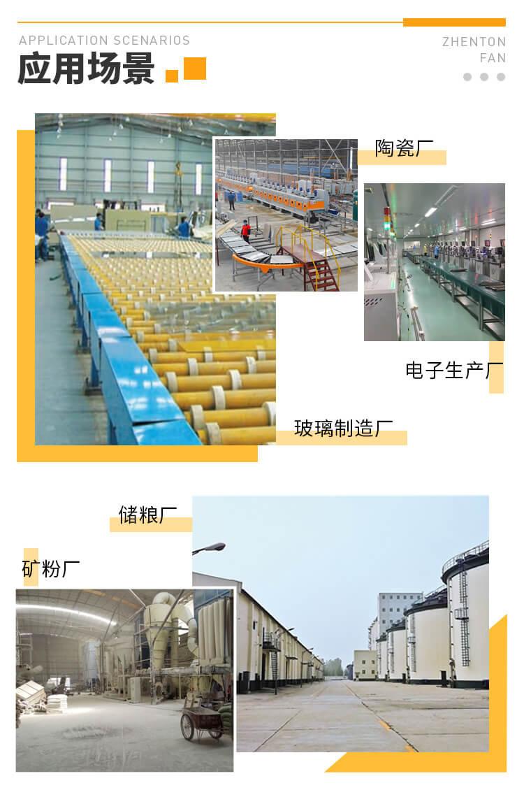 一般適用于鍛冶廠、、玻璃廠、, 陶瓷廠、無(wú)線電廠等高壓強(qiáng)制通風(fēng)及糧食廠、飼料廠、礦粉廠、沙場(chǎng)等加工行業(yè)的物料輸送。