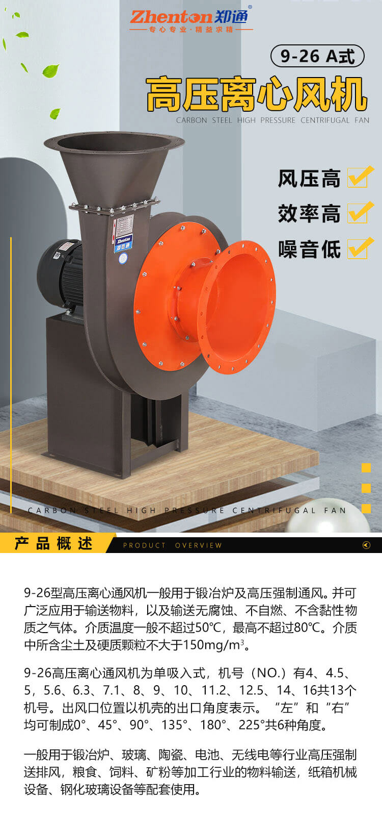 9-26型高壓離心通風機一般用于鍛冶爐及高壓強制通風。并可廣泛應用于輸送物料,以及輸送無腐蝕、不自燃不含黏性物質之氣體。介質溫度一般不超過50°C, 最高不超過80°C。介質中所含塵土及硬質顆粒不大于150mg/m3。