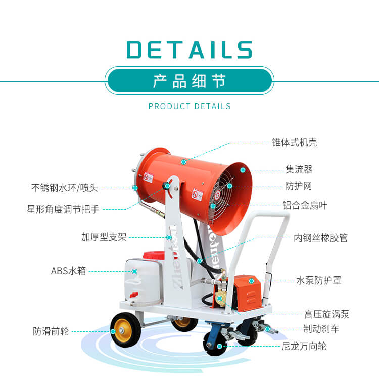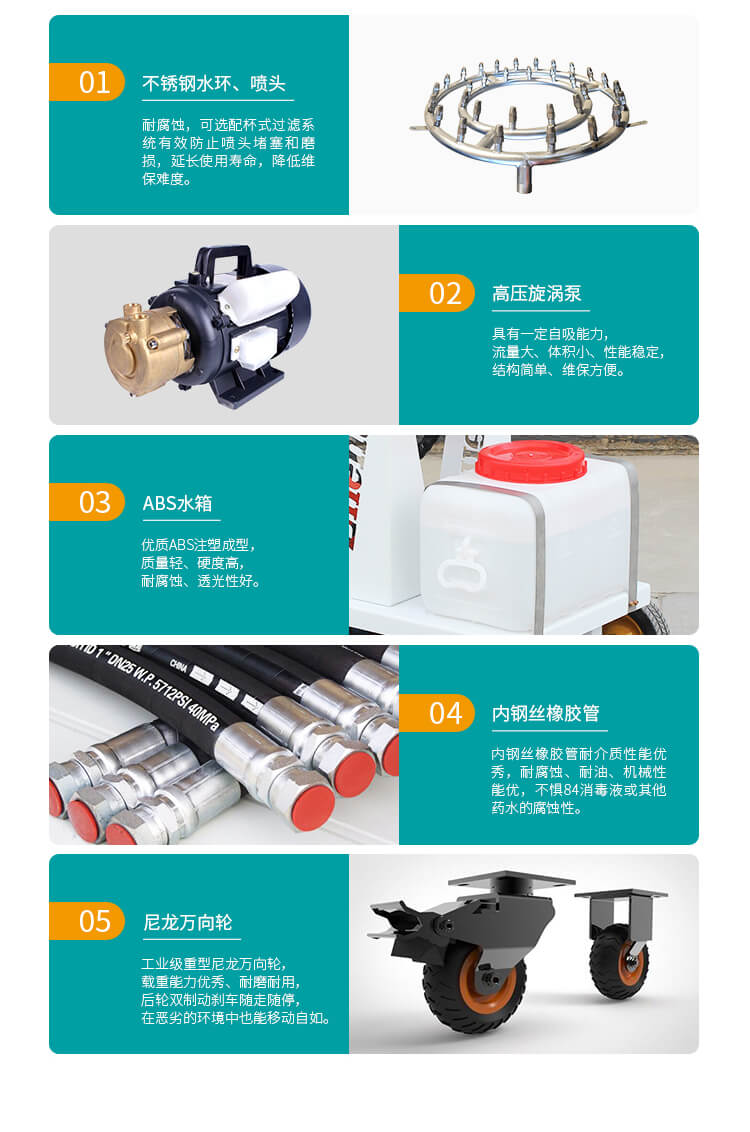 配備大容量ABS防腐水箱、不銹鋼水環(huán)、耐腐蝕橡膠軟管,不懼消毒水腐蝕性;電源可選配220V電源或48V直流電瓶,綠色能源噪聲低無污染,移動范圍不受電源問題限制,可勝任更多環(huán)境下噴灑任務(wù)。