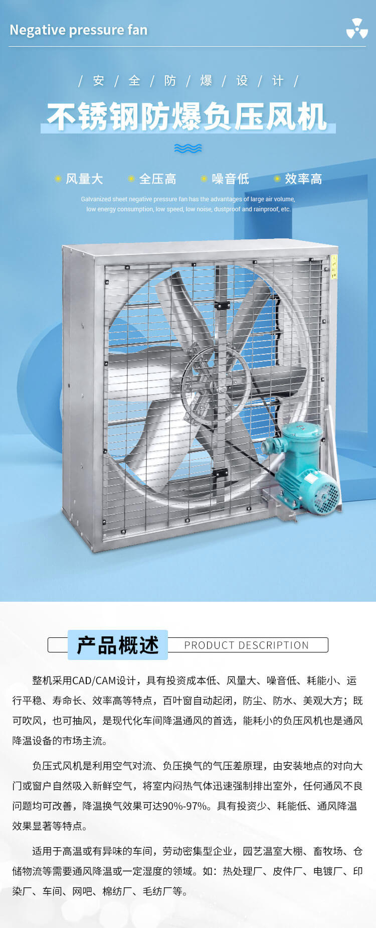 整機采用CAD/CAM設(shè)計,具有投資成本低、風(fēng)量大、噪音低、耗能小、運行平穩(wěn)、壽命長、效率高等特點,百葉窗自動起閉,防塵、防水、美觀大方;既可吹風(fēng),也可抽風(fēng),是現(xiàn)代化車間降溫通風(fēng)的首選,能耗小的負壓風(fēng)機也是通風(fēng)降溫設(shè)備的市場主流。 負壓式風(fēng)機是利用空氣對流、負壓換氣的氣壓差原理,由安裝地點的對向大門或窗戶自然吸入新鮮空氣,將室內(nèi)悶熱氣體迅速強制排出室外,任何通風(fēng)不良問題均可改善,降溫換氣效果可達90%-97%。具有投資少、耗能低、通風(fēng)降溫效果顯著等特點。