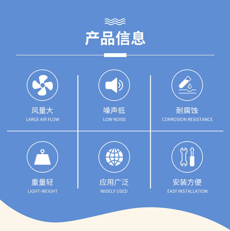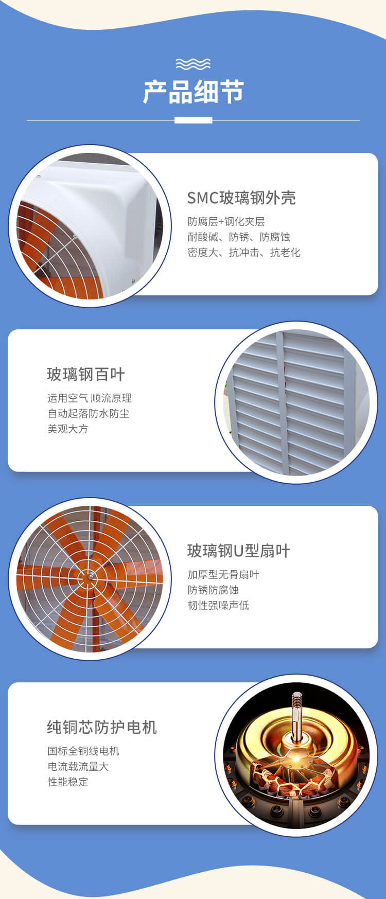 具有抗紫外線,耐酸堿,防腐、防銹等特點,采用CAD/CAM優(yōu)化設(shè)計制造,全壓高,風(fēng)量大,噪音低,耗能小,運行平穩(wěn),壽命長,百葉窗可通過手動或自動啟動達到防塵防水的目的,美觀大方,電機下置,維護保養(yǎng)更方便。