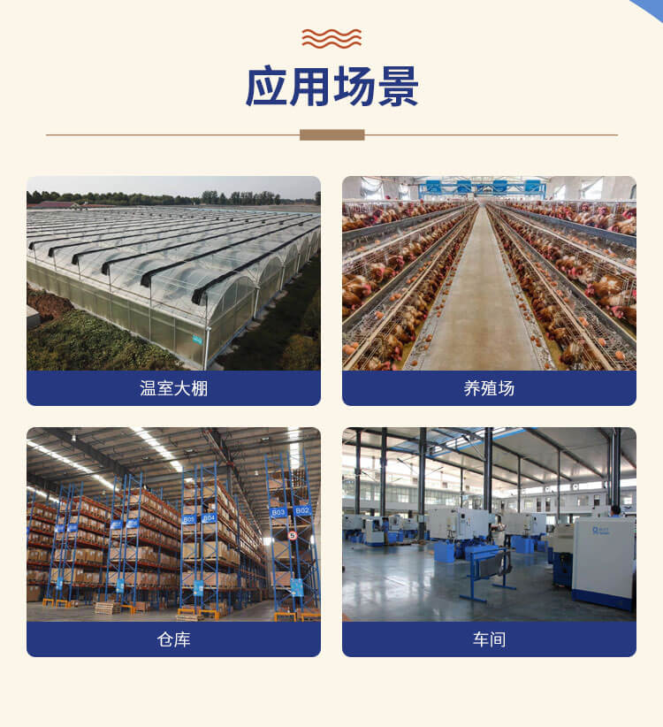 畜牧業(yè)、生產(chǎn)車間、倉庫等易產(chǎn)生廢棄、高溫、有異味、散熱或?qū)諝鉂穸扔邢拗茍鏊?,對空氣干濕度無限制領(lǐng)域通風(fēng)換氣。