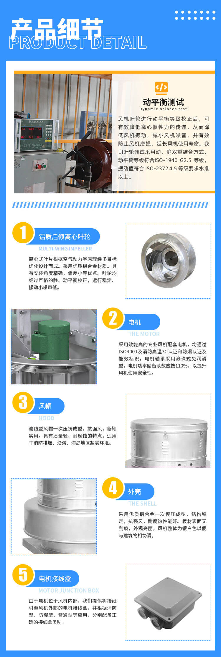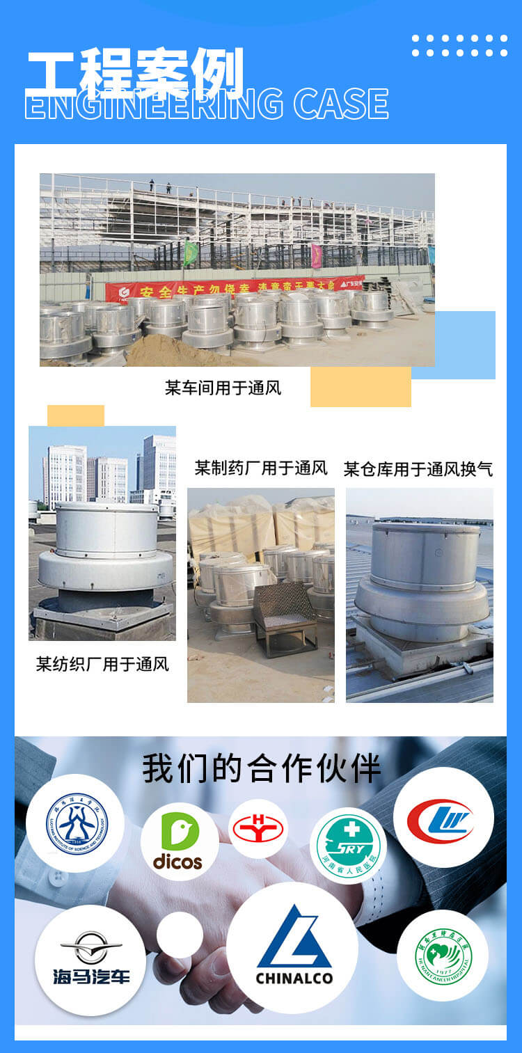 電機(jī)與排放氣流隔離,更適合排除帶有煙塵、油霧、潮濕等污染空氣,延長(zhǎng)電機(jī)及傳動(dòng)部件的使用壽命。采用全鋁質(zhì)后向板形離心式葉輪,平衡等級(jí)高,氣流組織順暢,運(yùn)行平穩(wěn);具有重量輕、壓力高、風(fēng)量適中、噪聲低、耗電省、外形美觀牢固等優(yōu)點(diǎn),廣泛用于機(jī)械、化工、橡膠、制藥、輕紡等行業(yè)的車間高大廠房及高級(jí)民用建筑的屋頂排風(fēng)換氣。