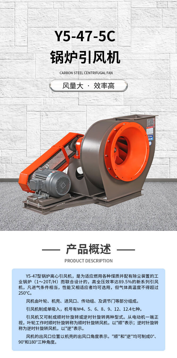 Y5-47-C鍋爐引風(fēng)機(jī),適用于燃用各種煤質(zhì)并配有消煙除塵裝置 的0.2-20t/h工業(yè)鍋爐,以為進(jìn)氣條件相當(dāng)、性能又相適應(yīng)者均可采用,但最高溫度不超過250℃。