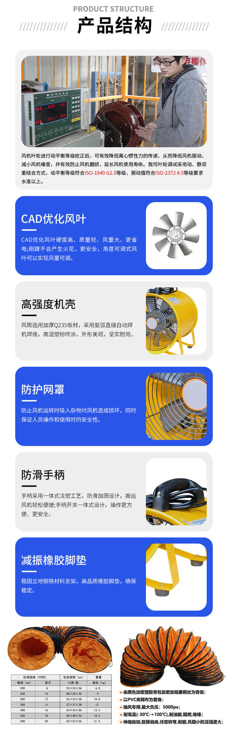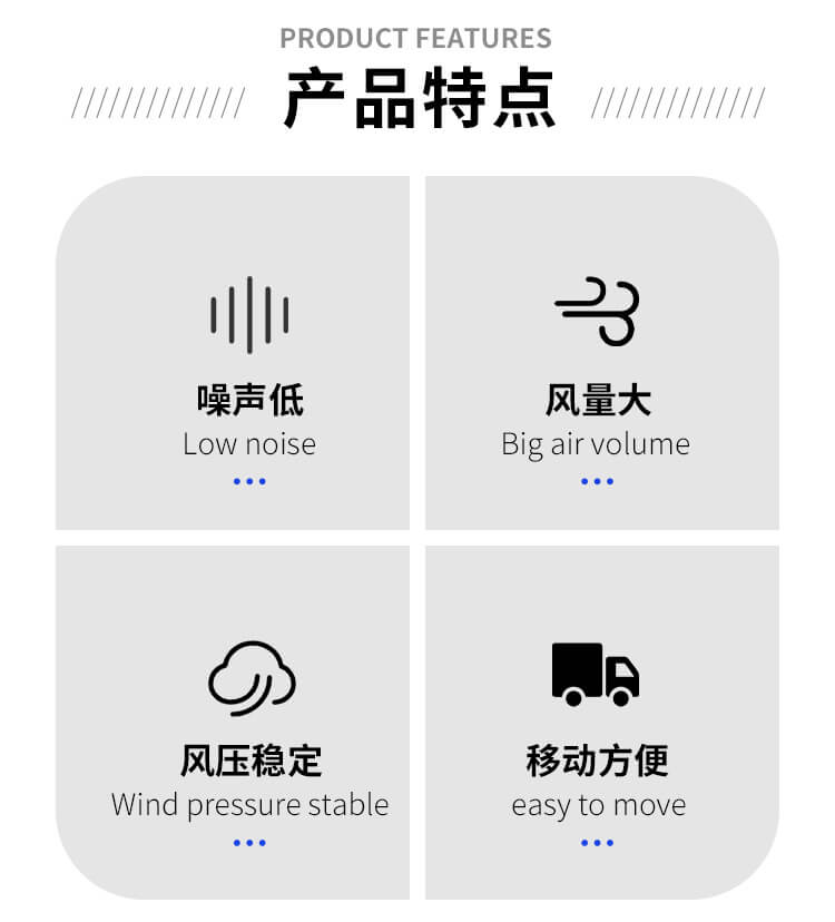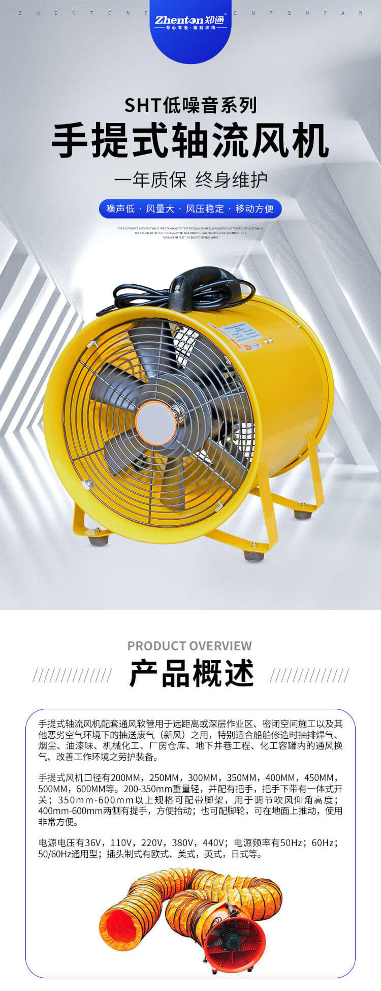 手提式風(fēng)機(jī)口徑有200MM,250MM,300MM,350MM,400MM,450MM,50OMM,60OMM等。200-350mm重量輕,并配有把手,把手下帶有一體式開關(guān);350mm-600mm以上規(guī)格可配帶腳架,用于調(diào)節(jié)吹風(fēng)仰角高度;400mm-600mm兩側(cè)有提手,方便抬動(dòng);也可配腳輪,可在地面上推動(dòng),使用非常方便。
