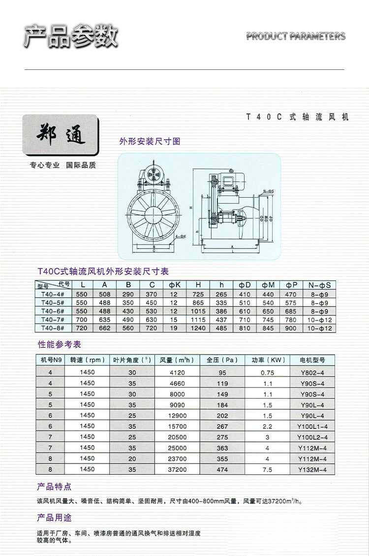 T40C式軸流風(fēng)機翼型鋁合金壓鑄葉片、性能優(yōu)良、造型美觀,可用于排送相對濕度較大、溫度較高的氣體